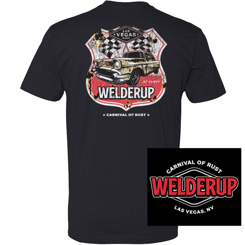 The Welder Up 1957 Chevy / Route 66 artwork is printed on the back of a black crew neck t-shirt. The fabric is CVC Jersey, 60% Combed Ring-Spun Cotton / 40% Polyester. This top of the line fabric stands up to consistent wear without sacrificing fit or feel. A small logo is printed on the front left chest. It is available in sizes Small through 4XL.