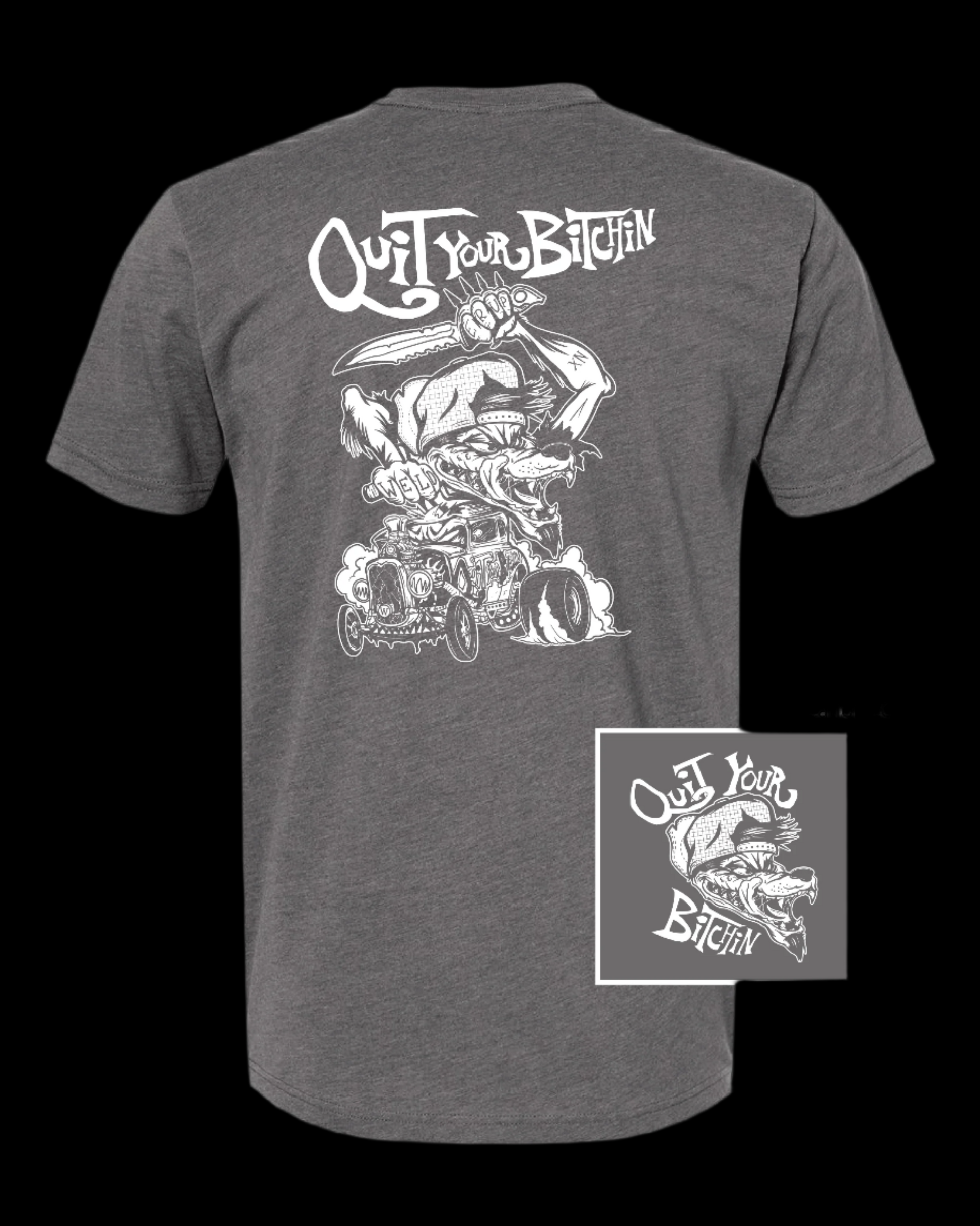 The Welder Up Quit Your Bitchin' Wolf white artwork is printed on the back of a Heathered Heavy Metal Gray crew neck t-shirt. The fabric is CVC Jersey, 60% Combed Ring-Spun Cotton / 40% Polyester. This top-of-the-line fabric withstands consistent wear without compromising fit or feel. A small logo is printed on the front left chest. It is available in sizes Small through 3XL.