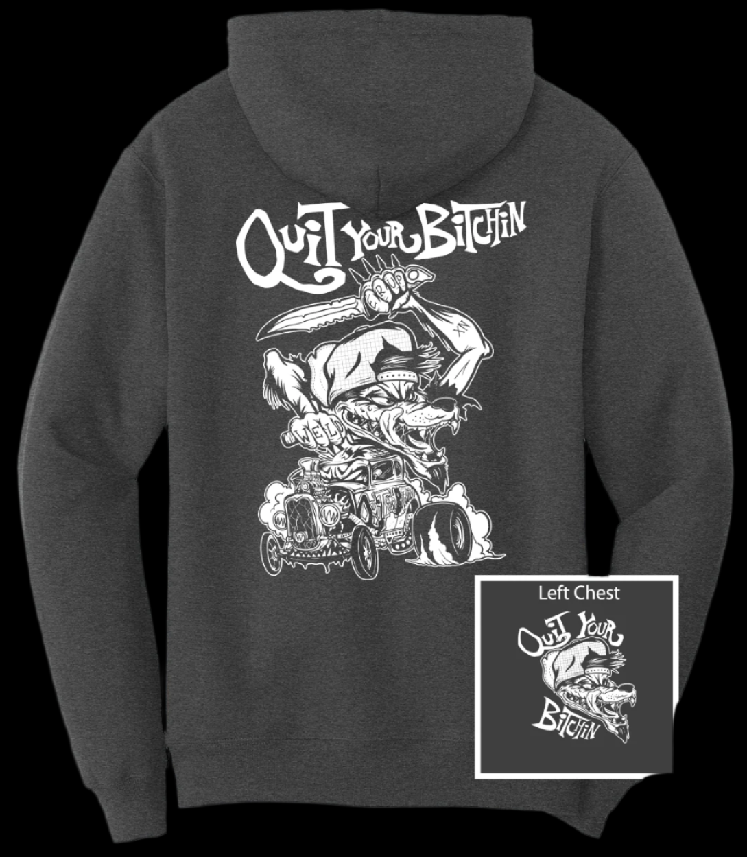 The Welder Up QYB Wolf Dark Heathered Gray Sweatshirt features a cartoon version of the 1930 Ford Model A "Quit Your Bitchin" on the back and a small logo on the front left chest. It is available in sizes Small through 4XL.
